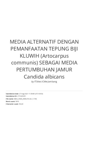 Ameliya, Erza Sindi (2025) Media Alternatif Dengan Pemanfaatan Tepung Biji Kluwih (Artocarpus communis) Sebagai Media Pertumbuhan Jamur Candida albicans. Diploma thesis, ITSKes Insan Cendekia Medika Jombang.